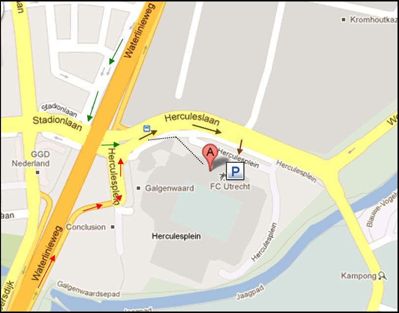 Vanaf de A12: Volg de borden Ring Zuid. Vervolgens neemt u afrit 18 richting Lunetten/Houten. Neem op de rotonde de afslag richting Lunetten. U rijdt nu op de Waterlinieweg. Neem op de Waterlinieweg afrit Stadion Galgenwaard. Onderaan de afrit linksaf en bij de stoplichten rechts aanhouden. Het stadion bevindt zich aan uw rechterzijde.