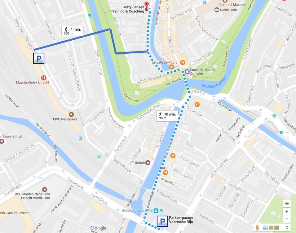 U kunt ook uitstappen op station Utrecht-Vaartsche Rijn. Van daaruit is het ca. 7 minuten lopen, zie bovenstaande kaart (blauwe stippellijn). Voor een passende reisplanning kijkt u op www.9292.nl